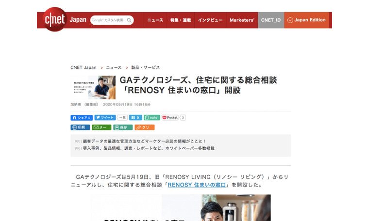 CNET Japan|『GAテクノロジーズ、住宅に関する総合相談「RENOSY 住まいの窓口」開設』