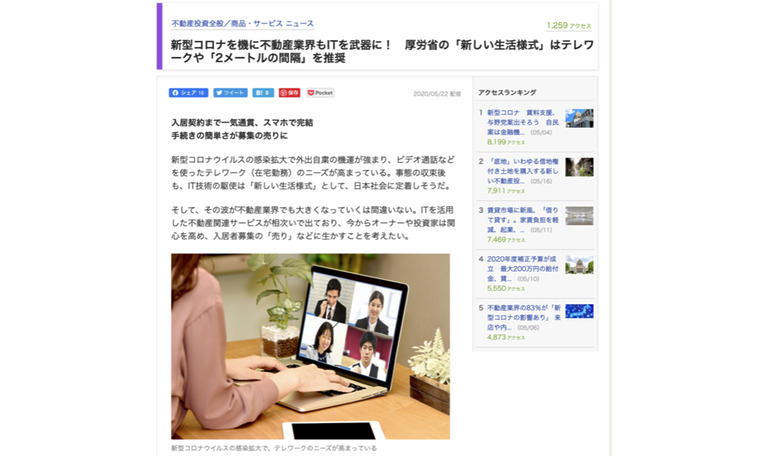 『新型コロナを機に不動産業界もITを武器に! 厚労省の「新しい生活様式」はテレワークや「2メートルの間隔」を推奨』