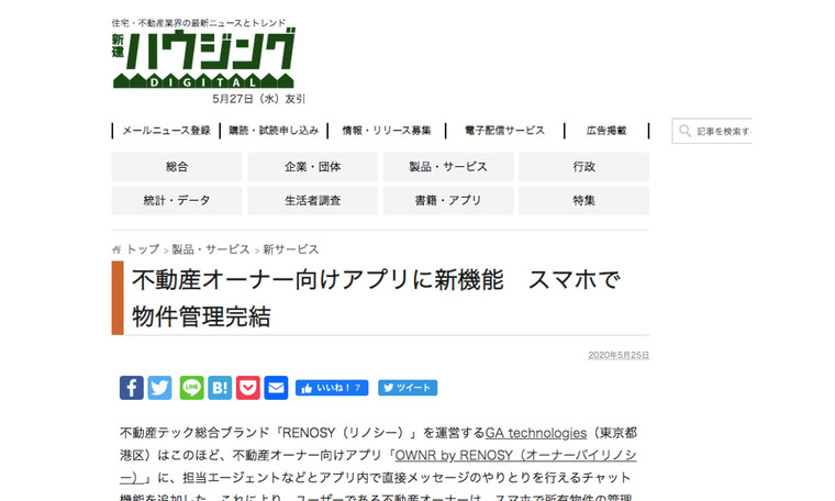 新建ハウジングにて、不動産オーナー向けアプリ「OWNR by RENOSY(オーナー バイ リノシー)」へのチャット機能をご紹介いただきました。