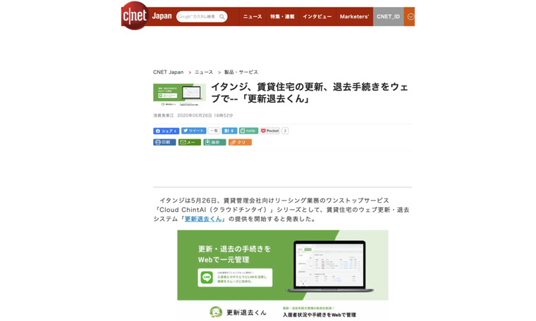 Cnet Japan|『イタンジ、賃貸住宅の更新、退去手続きをウェブで--「更新退去くん」』