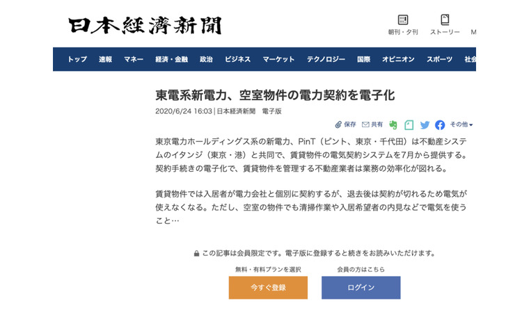日本経済新聞にて、当社のグループ会社であるイタンジと東京電力グループのPinTとの協業について取り上げていただきました。
