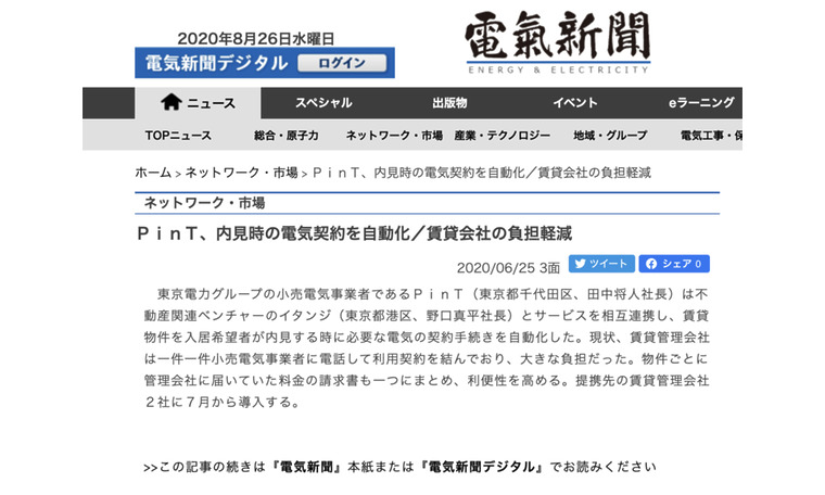 【掲載情報】電気新聞(2020.06.25)『PinT、内見時の電気契約を自動化/賃貸会社の負担軽減』