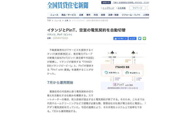 【掲載情報】全国賃貸住宅新聞(2002.06.29号、WEB版:2020.07.02)『イタンジとPinT、空室の電気契約を自動切替』