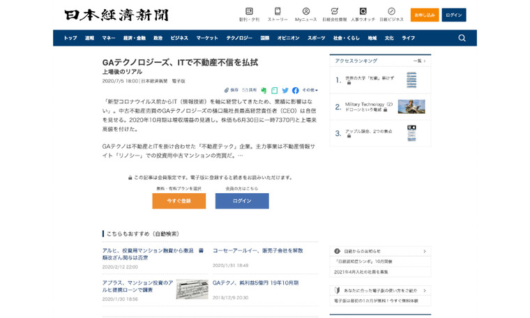 【掲載情報】日本経済新聞(2002.07.06号、WEB版:2020.07.05)『GAテクノロジーズ、ITで不動産不信を払拭』