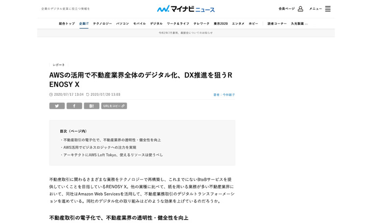Amazon Web Servicesを活用した、不動産業務取引のデジタルトランスフォーメーションに関して、専務取締役執行役員 兼 RENOSY X 代表取締役 清水とRENOSY X のProduct Development Division日平を取材いただきました。