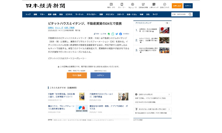 日経新聞電子版および日経MJにて、当社のグループ会社であるイタンジとピタットハウスネットワークの業務提携について取り上げていただきました。