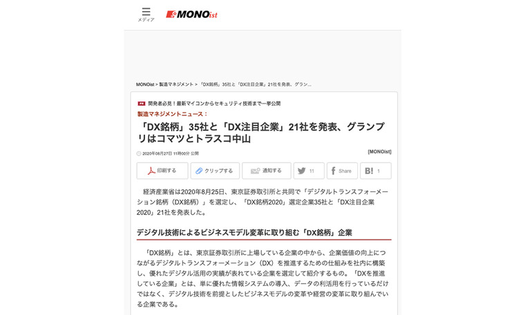 MONOistにて、当社が「デジタルトランスフォーメーション銘柄(DX銘柄)」に選定されたことについて取り上げていただきました。