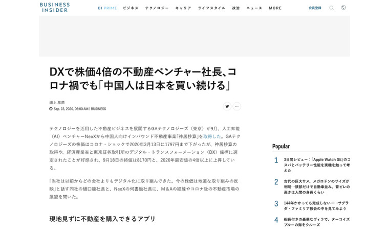 BUSINESS INSIDER|『DXで株価4倍の不動産ベンチャー社長、コロナ禍でも「中国人は日本を買い続ける」』