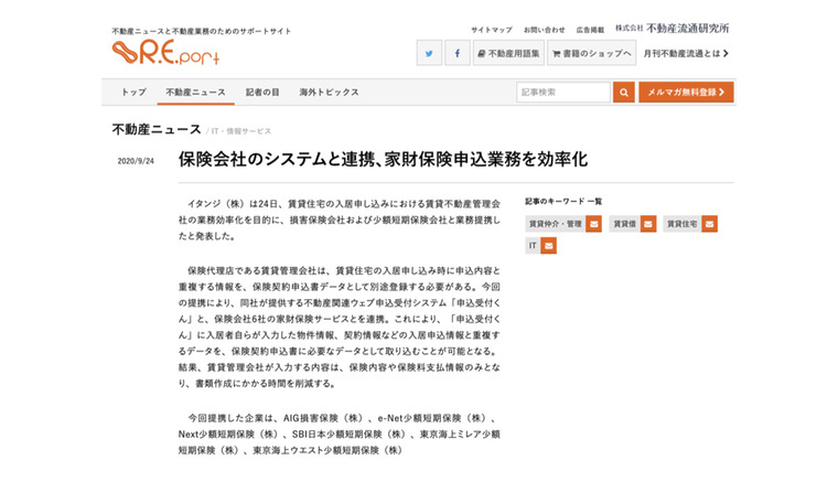 R.E.portにて、当社のグループ会社であるイタンジが、損害保険会社および少額短期保険会社と業務提携したことについて取り上げていただきました。