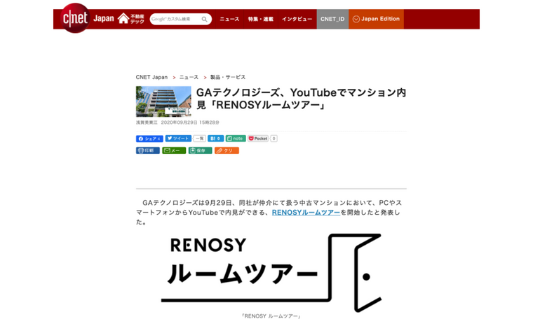 CNET Japanにて、YouTubeで中古マンションの内見ができる「RENOSY ルームツアー」をご紹介いただきました。