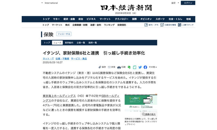日本経済新聞|イタンジ、家財保険6社と連携 引っ越し手続き効率化