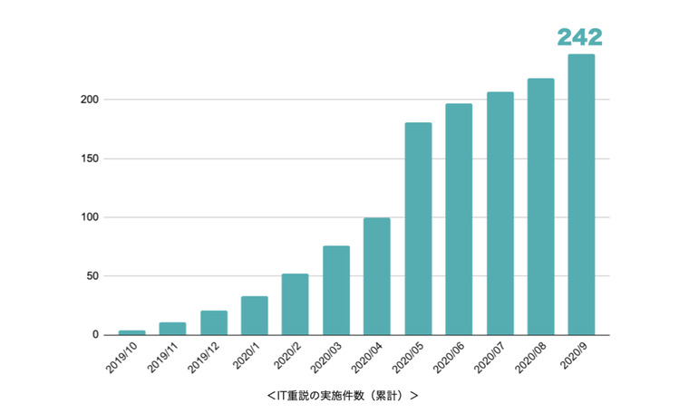 当社では、2019年10月1日〜2020年9月30日の期間で、242件のIT重説を実施しました。全件が、投資用不動産の売買契約における実施です。