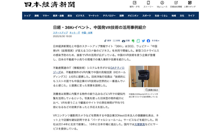 日本経済新聞にて、当社のCMO田吹が登壇した日経・36Kr主催ウェブセミナー「中国発VRが変えるコロナ後のビジネス」の様子を日本経済新聞電子版にて、田吹のコメント入りでご紹介いただきました。