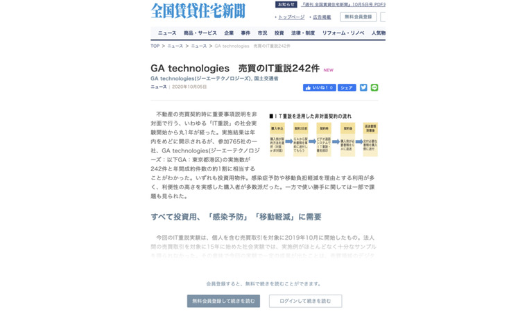 全国賃貸住宅新聞にて、不動産の売買契約時に重要事項説明を非対面で行う、通称「IT重説」について、社会実験開始から1年のタイミングで弊社の取り組みを取り上げていただきました。
