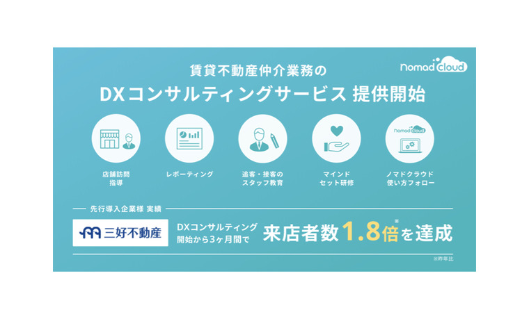 当社のグループ会社である、テクノロジーで不動産の賃貸取引をなめらかにするイタンジ株式会社(本社:東京都港区、代表取締役:野口 真平、以下「イタンジ」)は、「ノマドクラウド(https://nomad-cloud.jp/)」を導入している賃貸不動産仲介(以下「賃貸仲介」)会社を対象に、賃貸仲介業務におけるDXコンサルティングサービスの提供を開始しました。
