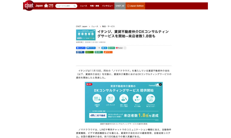 CNET Japanにて、当社のグループ会社であるイタンジが提供開始した、「ノマドクラウド」を導入している賃貸不動産仲介会社を対象とするDXコンサルティングサービスについてご紹介いただきました。