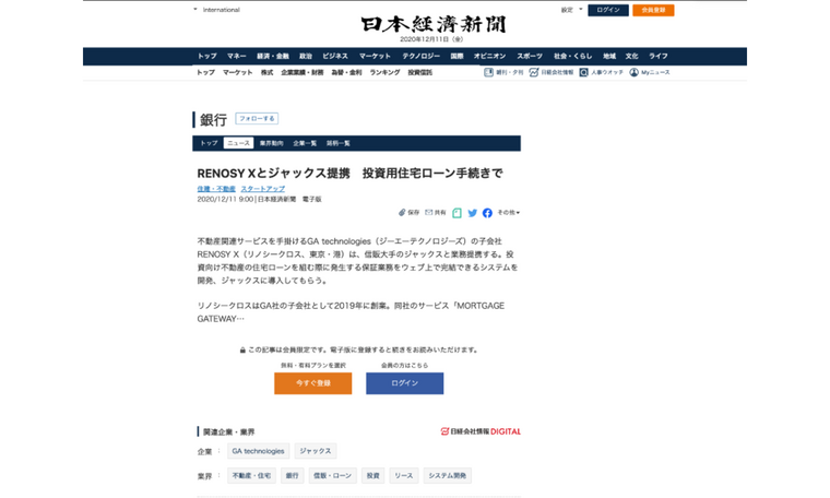 日本経済新聞にて、当社のグループ会社であるRENOSY Xと信販大手の株式会社ジャックスとの業務提携についてご紹介いただきました。