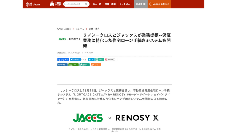CNET Japanにて、当社のグループ会社であるRENOSY Xと株式会社ジャックスとの業務提携についてご紹介いただきました。