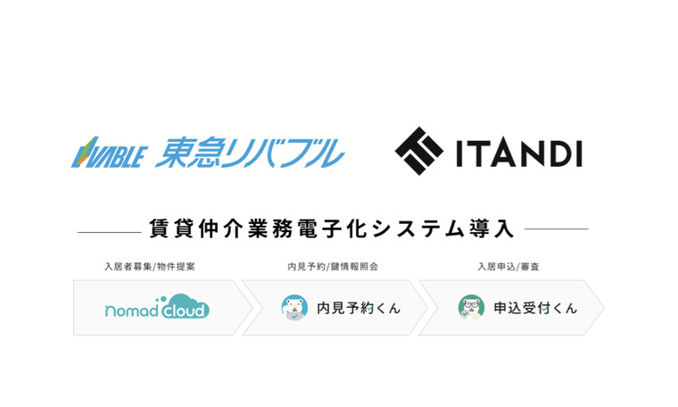 1. 東急リバブルは賃貸仲介業務を電子化するため、イタンジが提供する「ノマドクラウド」「内見予約くん」「申込受付くん」を順次導入
