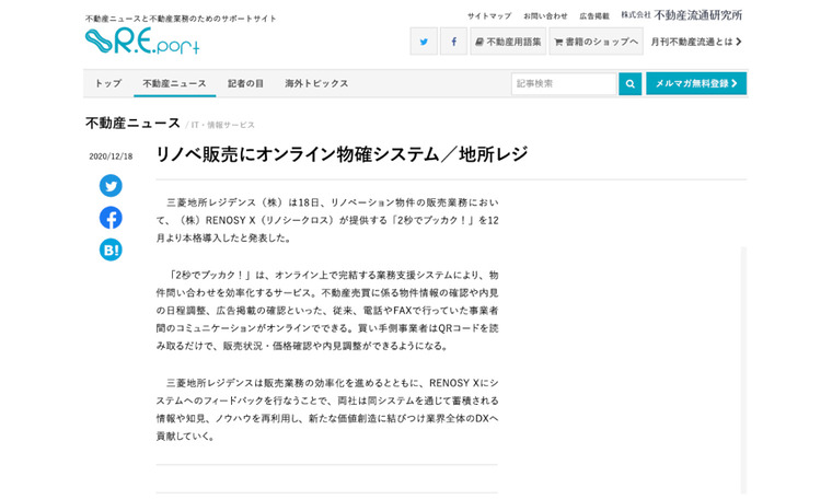 R.E.portにて、当社グループ会社のRENOSY Xが三菱地所レジデンス株式会社へ「2秒でブッカク!」を提供開始したことについてご紹介いただきました。