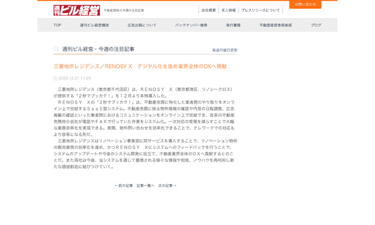 週刊ビル経営にて、当社グループ会社のRENOSY Xが三菱地所レジデンス株式会社へ「2秒でブッカク!」を提供開始したことについてご紹介いただきました。