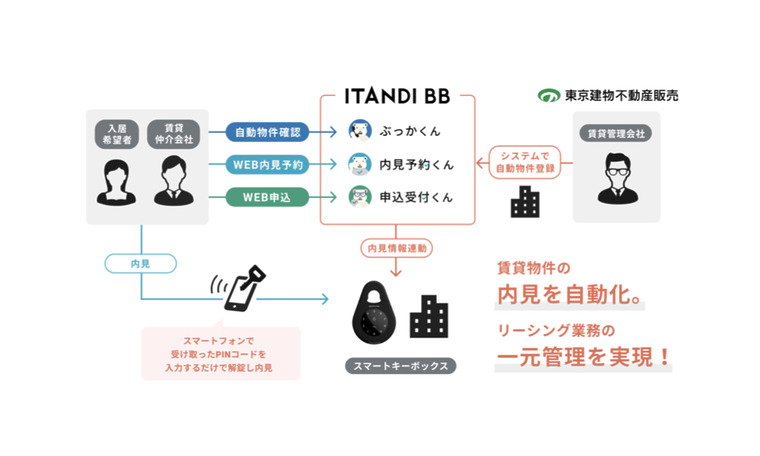 当社のグループ会社であるイタンジ株式会社は、東京建物不動産販売株式会社に、イタンジが提供するITANDI BBシリーズの賃貸住宅内見予約WEB 受付システム「内見予約くん(https://lp.itandibb.com/naiken-yoyaku/)」と、株式会社ザ・レジェンドが日本国内で販売する「igloohome(イグルーホーム)」のIoTスマートキーボックスとの連携サービスの提供を開始いたします。