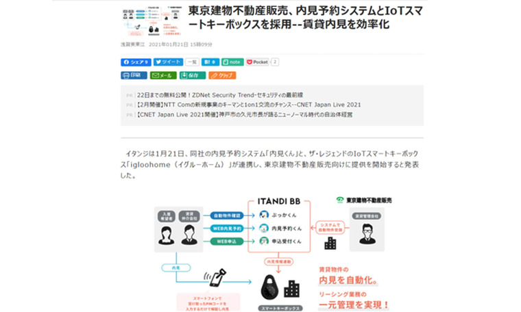 CNET Japanにて、当社のグループ会社であるイタンジの内見予約システム「内見くん」と、ザ・レジェンドのIoTスマートキーボックス「igloohome(イグルーホーム)」が連携し、東京建物不動産販売向けにサービス提供を開始することについて取り上げていただきました。