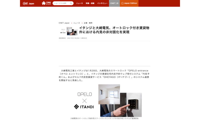 CNET Japanにて、当社グループ会社のイタンジが提供する「内見予約くん」、「OHEYAGO(オヘヤゴー)」と大崎電気工業株式会社が提供する「OPELO entrance(オペロ エントランス)」のシステム連携についてご紹介いただきました。