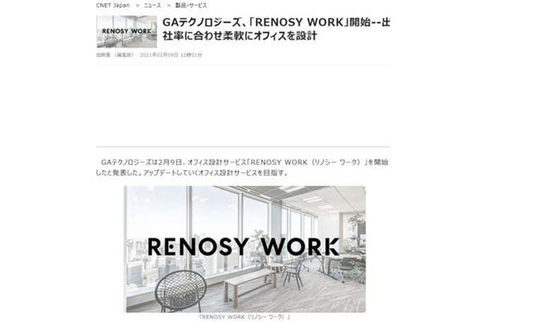 CNET Japanにて、 当社のオフィス設計サービス「RENOSY WORK(リノシー ワーク)」について取り上げていただきました。