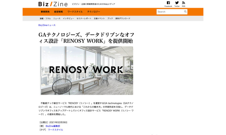 Biz/Zinにて、当社が提供開始したデータドリブンなオフィス設計サービス「RENOSY WORK」をご紹介いただきました。