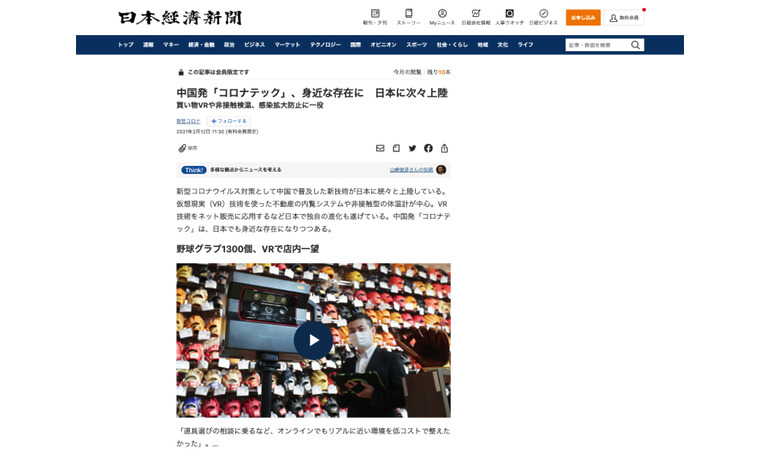 日本経済新聞|『中国発「コロナテック」、身近な存在に、日本に次々上陸 買い物VRや非接触検温、感染拡大防止に一役』