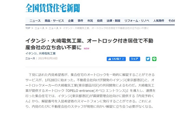 全国賃貸住宅新聞|『イタンジ・大崎電気工業、オートロック付き居住で不動産会社の立ち合い不要に』
