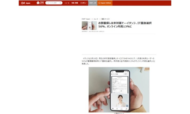CNET Japanにて、当社のグループ会社であるイタンジの 非対面部屋探しサービス「OHEYAGO」 について取り上げていただきました。