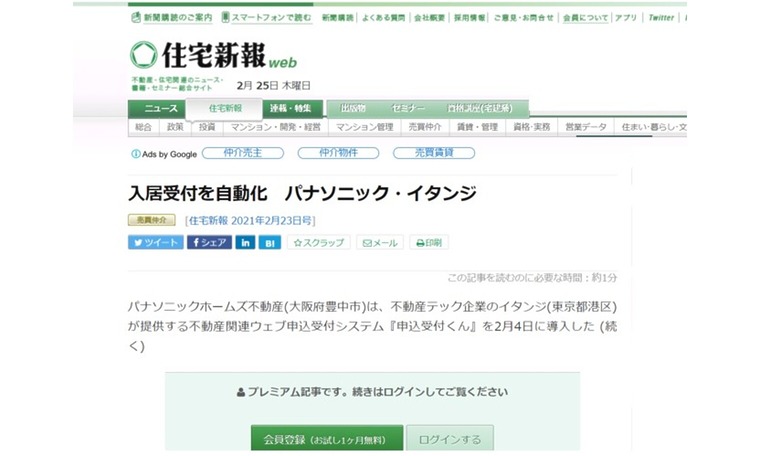 【掲載情報】住宅新報(2021.02.25)『入居受付を自動化 パナソニック・イタンジ』