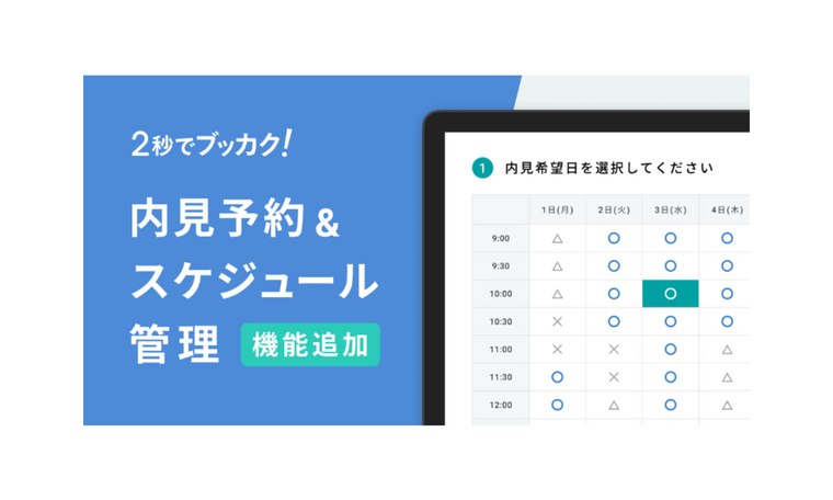新機能では、不動産事業者の内見予約にかかる作業をデジタル化させ数クリックで内見の予約、問い合わせ、自動メール返信までをオンライン上で完結させることが可能となりました。また、内見後のアンケートメールを自動で送信するなど、内見後のフォローを自動化し、顧客管理業務をサポートします。