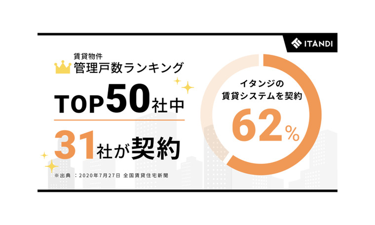 当社のグループ会社である、テクノロジーで不動産の賃貸取引をなめらかにするイタンジ株式会社は、2021年3月、賃貸物件管理戸数ランキングトップ50社(※)の内62%である31社と、イタンジが提供する賃貸不動産業務支援システムの導入契約を締結したことをお知らせします。