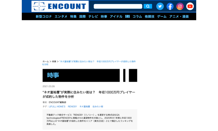 ENCOUNTにて、当社が発表した「住みたい街ランキング2021 by RENOSY」についてご紹介いただきました。