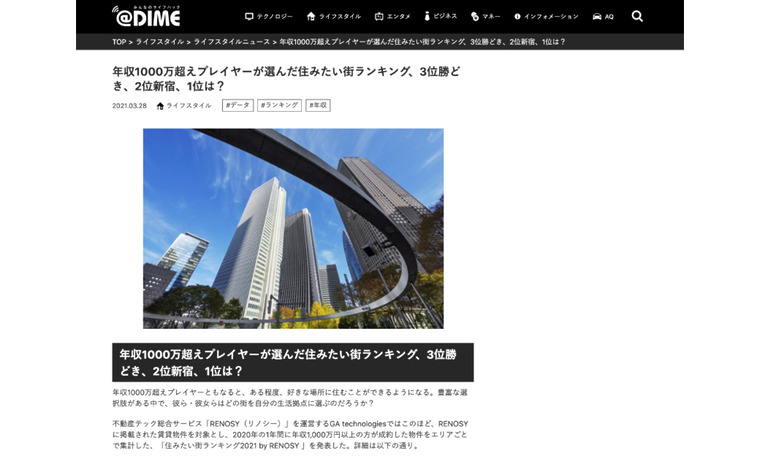 @DIMEにて、当社が発表した「住みたい街ランキング2021 by RENOSY」についてご紹介いただきました。