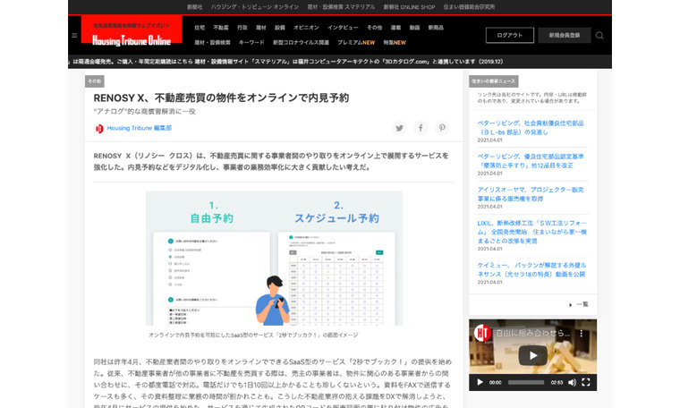 【掲載情報】Housing Tribune(2021.04.01) 『RENOSY X、不動産売買の物件をオンラインで内見予約 』