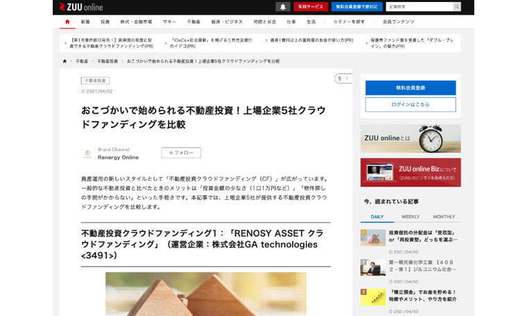 ZUU onlineにて、当社が提供するサービス「RENOSY クラウドファンディング(旧:RENOSY ASSET クラウドファンディング)」についてご紹介いただきました。