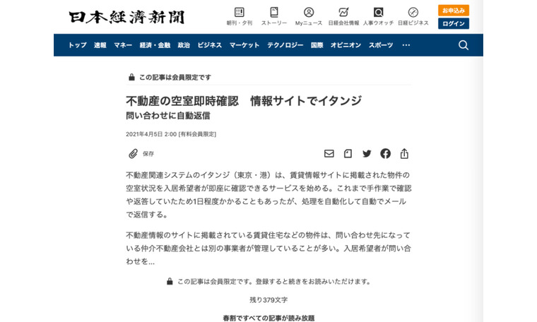 日本経済新聞|『不動産の空室即時確認 情報サイトでイタンジ 』