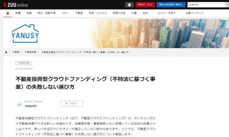 【掲載情報】ZUU online(2021.04.22)『不動産投資型クラウドファンディング(不特法に基づく事業)の失敗しない選び方』
