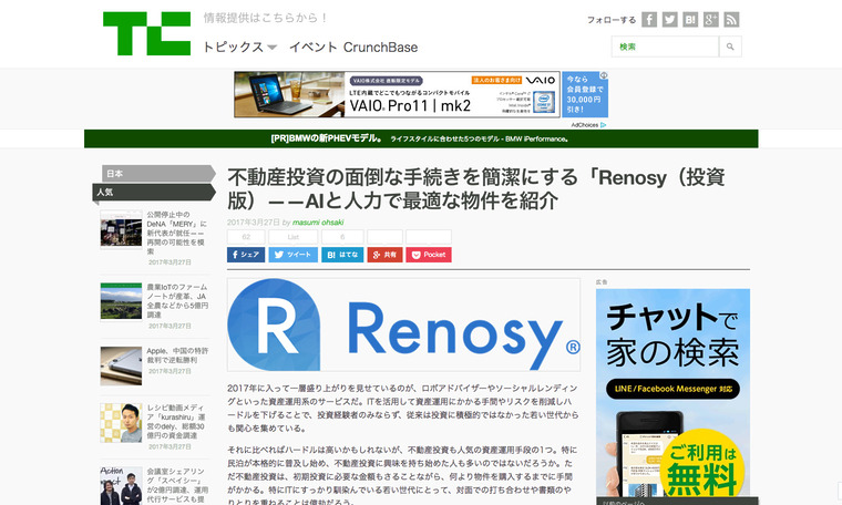TechCrunch Japanにて、Renosy(投資版)をご紹介いただきました。