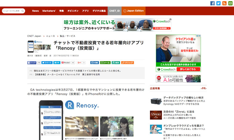CNET Japanにて、本日3/27(月)リリースのRenosy(投資版)をご紹介いただきました。Renosyサービスはもちろん、開発の背景である「若い世代の不動産投資のトレンド」についても、詳しくご紹介いただいております。