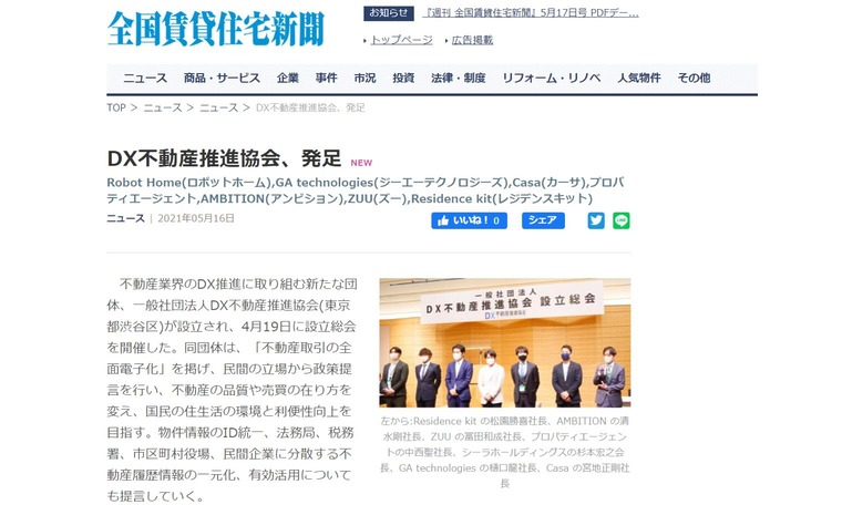 【掲載情報】全国賃貸住宅新聞(2021.05.16)『DX不動産推進協会、発足』