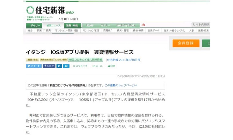 住宅新報にて、当社のグループ会社であるイタンジ株式会社の セルフ内見型賃貸情報サービス「OHEYAGO」(オヘヤゴー)について取り上げていただきました。