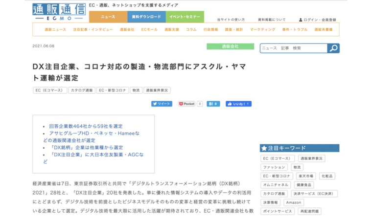 通販通信|『DX注目企業、コロナ対応の製造・物流部門にアスクル・ヤマト運輸が選定』