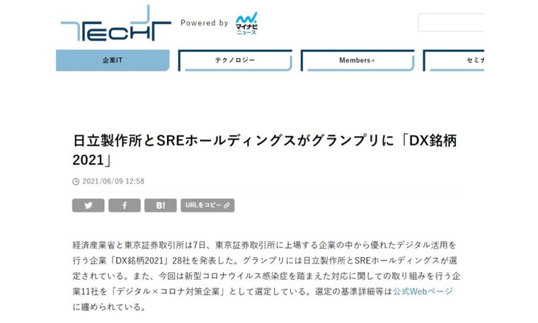 マイナビニュース|『日立製作所とSREホールディングスがグランプリに「DX銘柄2021」』