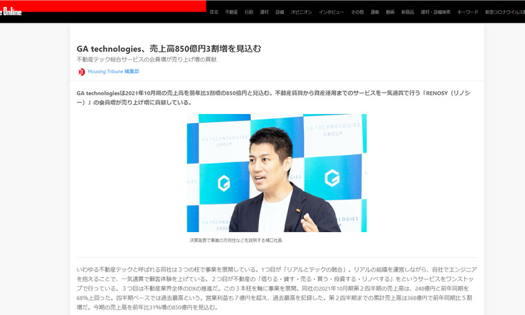 【掲載情報】Housing Tribune(2021.07.08)『GA technologies、売上高850億円3割増を見込む』
