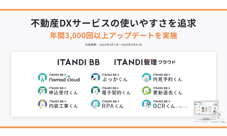当社のグループ会社であるイタンジ株式会社は、リアルタイム不動産業者間サイト「ITANDI BB」、および不動産賃貸業務のDXサービス群「ITANDI BB+」において、2022年4月1日〜2023年3月31日までの1年間で、入力方法や画面速度の改善、新機能の追加など、3,000回以上のアップデートを行なったことをお知らせします(※1)。